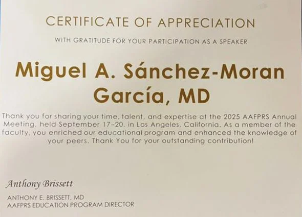 La Academia Americana de Cirugía Plástica Facial y Reconstructiva agradece al Dr. Miguel Sánchez-Morán por su valiosa participación y por compartir generosamente sus conocimientos durante el congreso celebrado en Nueva Orleans.